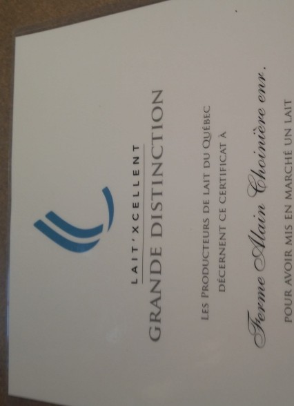 our la 5 ieme année consécutive la Ferme Alain Choiniere a obtenue un certificat-reconnaissance pour avoir mis en marché un lait de grande qualité tout au long de l'année 2015.